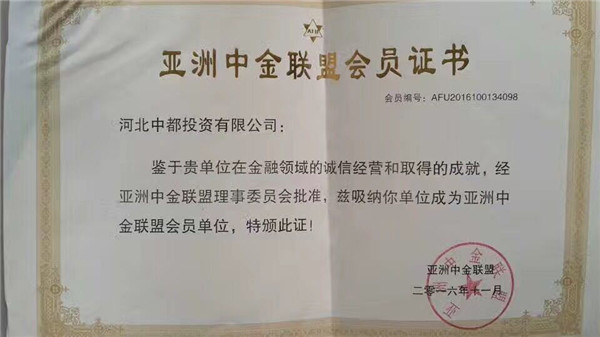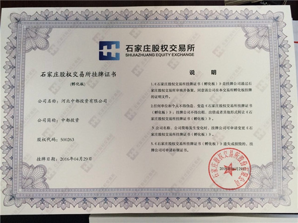河北中都投資有限公司是石家莊股權托管交易中心推薦機構會員單位,對企業在上股交掛牌提供眾多專項服務,法律咨詢服務等。幫助更多的企業能夠上市、融資提供了更多的是選擇機遇。2016年四月,在股權交易所,成功掛盤,股權代碼【500263】;2016年十一月,2017年、2018年、2019年躋身獲得亞洲中金聯盟會員單位等榮譽稱號。